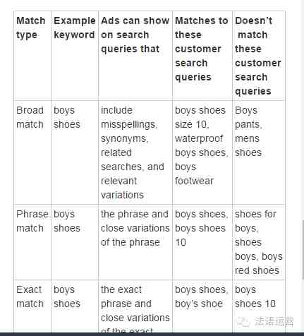 Broad:广泛匹配,哪些可以触发您广告的了,主要包括错误拼写、同义词、相关搜索以及关联的变化词。
