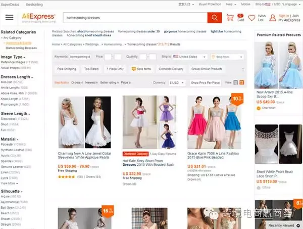 商品的标题描述作为商品描述的主要信息项,是在搜索匹配的关键因素。如下图的搜索命中演示。搜索homecoming dress,在商品标题中有homecoming dress在搜索排序中就会有较高的得分。