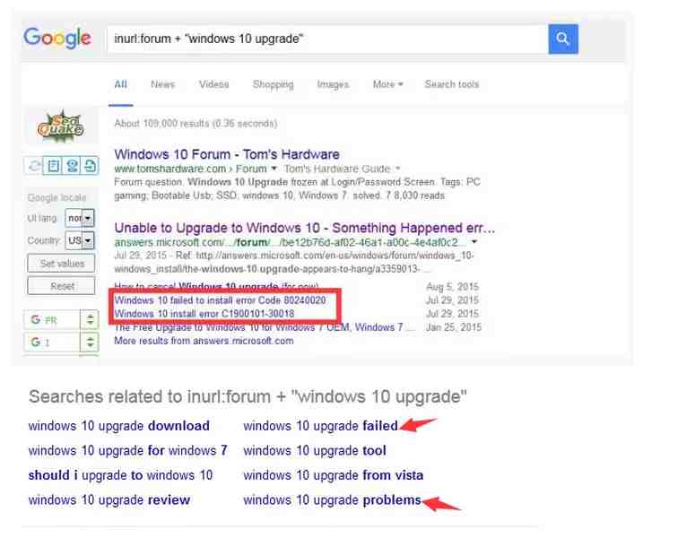 好了,既然有提示关键词,那就更好办了,直接缩小我们的检索范围,目标定在“”windows 10 upgrade failed”, 然后再重复上面的操作,过滤筛选,在过滤的过程中,我需要把那些与我们产品不相关或者无法关联的资讯给去掉(这里又涉及到对行业,产品知识熟悉度的能力了)。