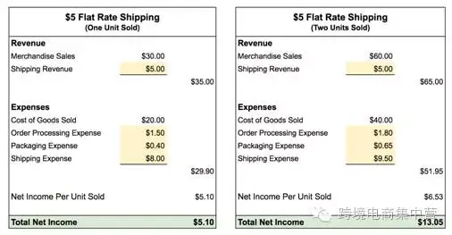 以上只是假设,而在实际情况中,当一个订单里含有2个单位商品时,它总体的费用要比处理一个商品的订单要少很多。因此不仅你的净利润会翻倍,单位净利润也会提高。