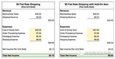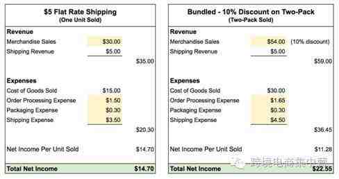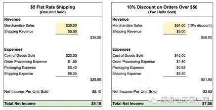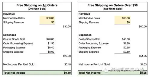 如图中所示,如果单个商品免运费,净利润将近于零,购买两个商品免运费,利润就大大提高了: