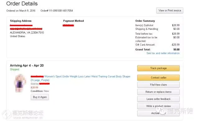 点击Order Details(订单详情),会更详细地罗列出该订单的全部信息,包括费用计算、付款方式、运费等等。