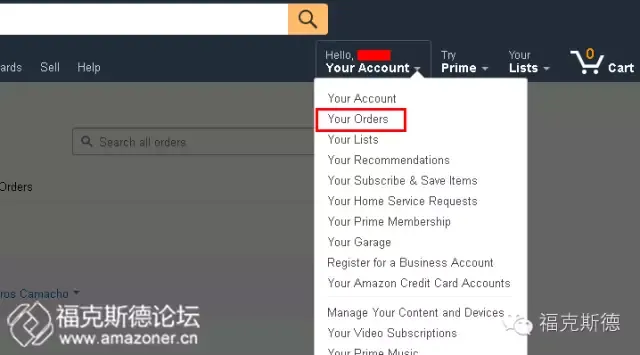 一、首先买家登录帐号,点击Your Account,下拉菜单中可看到Your Orders。