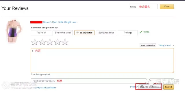 Review也可通过右上角的功能修改匿名。另外review没有规定时效,什么时候都可以留;美国站的review没有字数规定和限制,但是德国站和法国站最低需要20个单词;也可通过Add photos/video添加图片和视频。Review可通过Reviews Written by You这个功能,进行移除,也可修改。