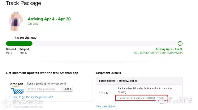二、点击Your Orders之后,页面会显示产品标题、图片、订单号、收货地址、预计到货时间等等。