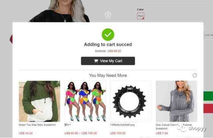 对于单品类垂直站来说,其主要销售额集中在20%的商品上。若当买家将商品加入购物车后,如果购物车内没有最近热卖的产品,那么系统就会自动弹窗提示,显示热卖品。