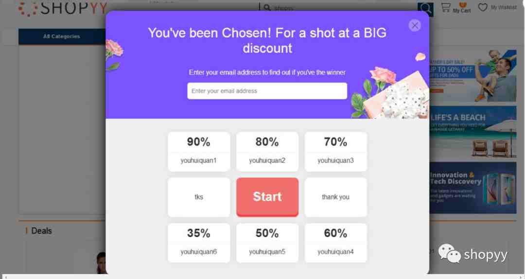 当买家进入网站时,网站会自动弹出抽奖的小游戏,这种方式可以提高网站的趣味性,增强用户的体验感,用户也可以使用抽到的优惠券进行下单购物。商家可以巧妙的利用这个功能,收集买家邮箱用于二次营销。同时也具有丰富网站页面,留住用户提高转化率的作用。