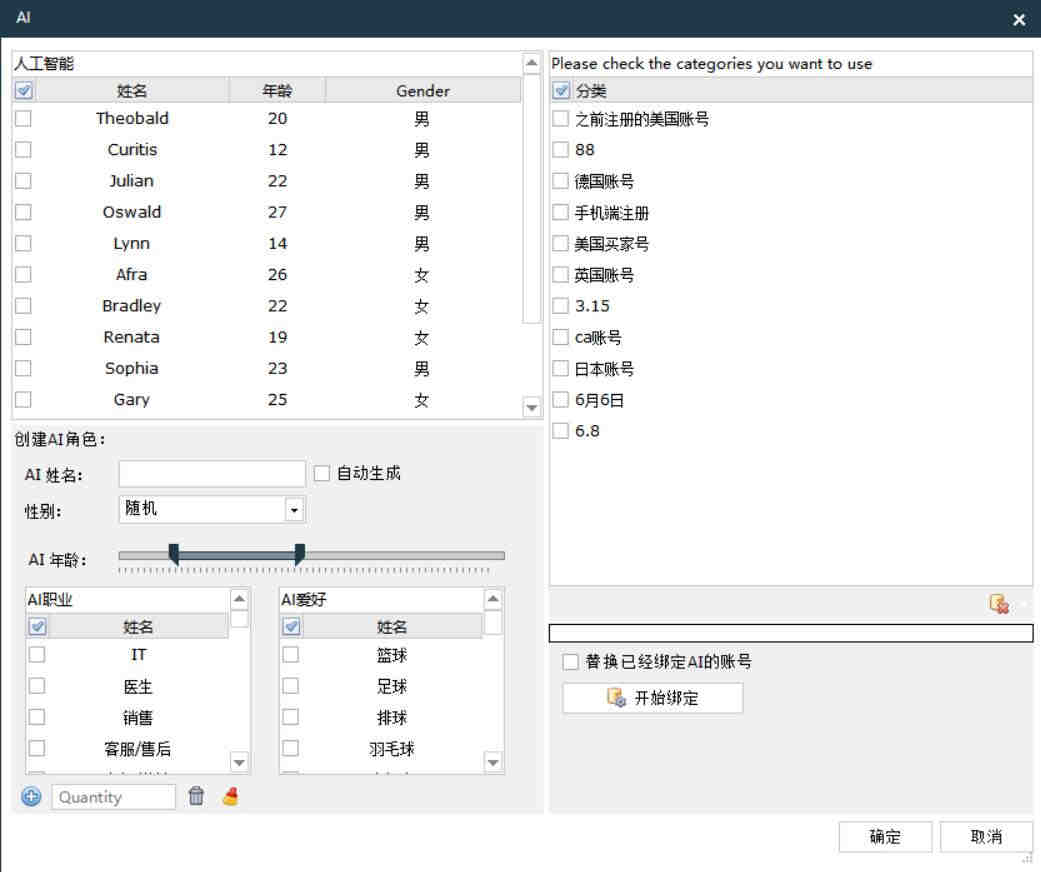 AI溜号功能是根据软件里面的创建AI界面进行设置自动生成AI姓名、随机生成AI性别及年龄,选择AI职业及爱好后生成一批新的AI角色,账号绑定AI角色后随机生成关键词进行点击浏览或加购。如果不想用AI角色生成的关键词,那么也可以手动设置自己需要浏览的关键词,账号点击浏览时间也可以自己随意设置,可以设置账号一次浏览5-10分钟,也可以设置一次浏览半小时以上。