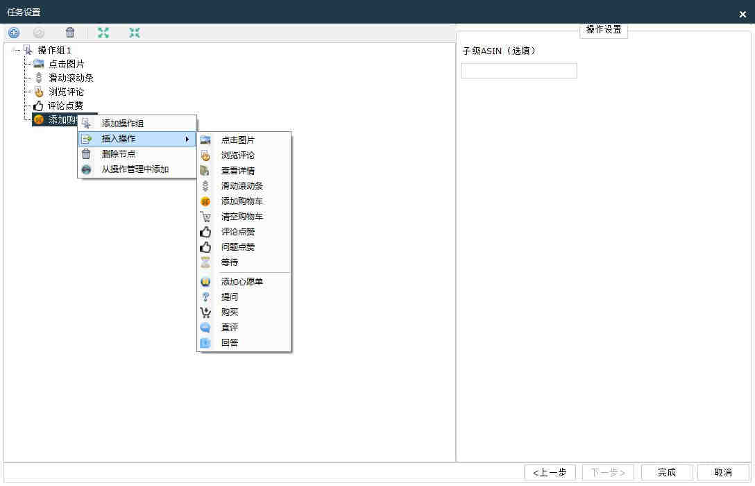 当然对于搜索加购任务,也可以用软件来进行操作,有两种操作方法可用,第一种是设置关键词及asin进行查找到详细关键词进行浏览操作,这一步可以根据自己平时的操作习惯进行完成,比如设置点击图片、查看详情、滑动滚动条、查看评论、评论点赞然后再点击加购!