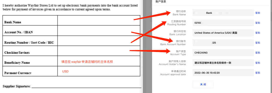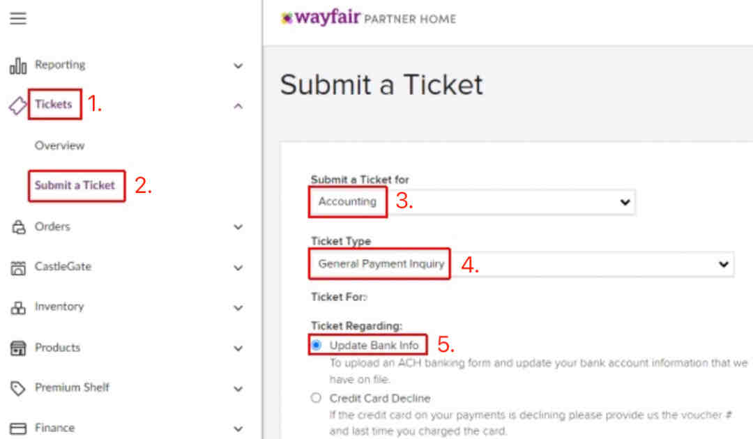 若您是北美站点卖家,请将美金收款银行账户信息填写至Wayfair邮件给您的ACH表格,并在Wayfair平台自行开立Ticket,将ACH表格作为附件提交给其财务团队。