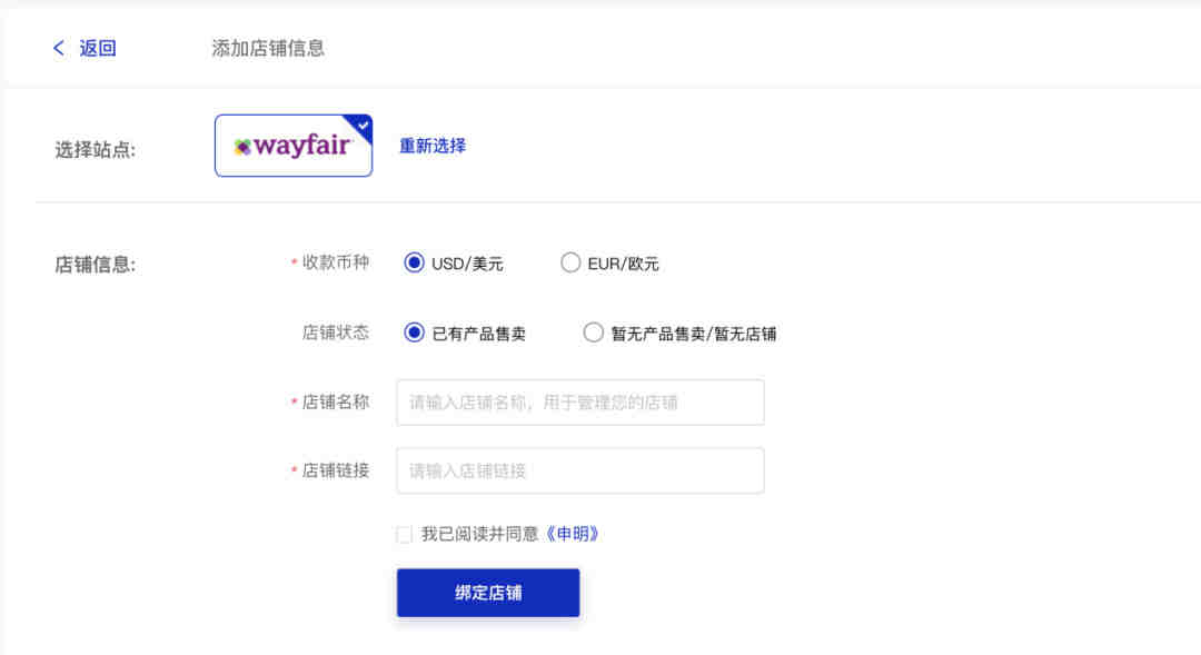 第四步 点击“绑定店铺”,绑定成功后将您的收款账户信息填写至Wayfair平台