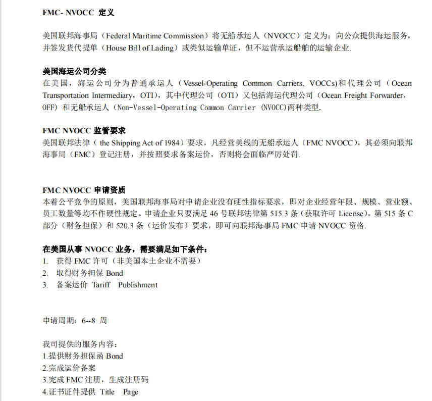 FMC对NVOCC的要求包括:拥有FMC颁发的执照;针对运输活动中产生的索赔具备偿付能力的财务证明;并公布运价本。