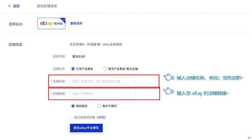 “店铺名称”:支持自定义(例如:安克创新),无需和您在eBay店铺名称对应,该名称是为了方便您在CoGoLinks管理您的店铺