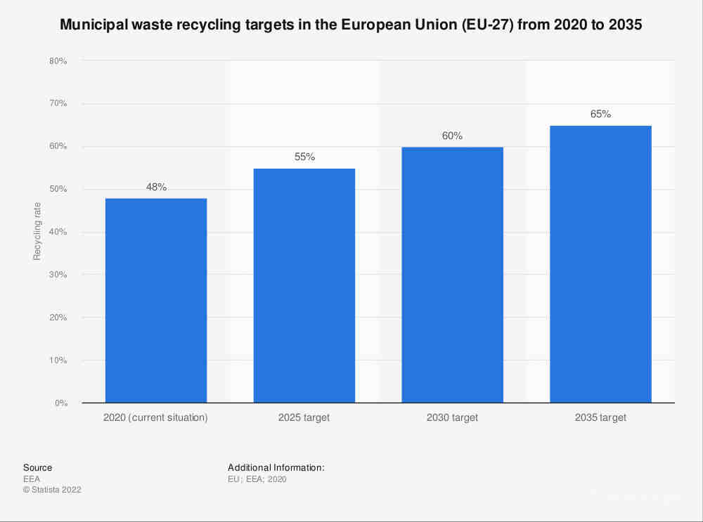 截至2020年,欧盟27国城市废弃物总体回收率达48%。根据欧盟委员会的废弃物管理框架指令,到2030年,欧盟每一成员国在法律上都有义务回收(或者准备再利用)60%的城市垃圾。到2035年,这一目标将提升至65%。