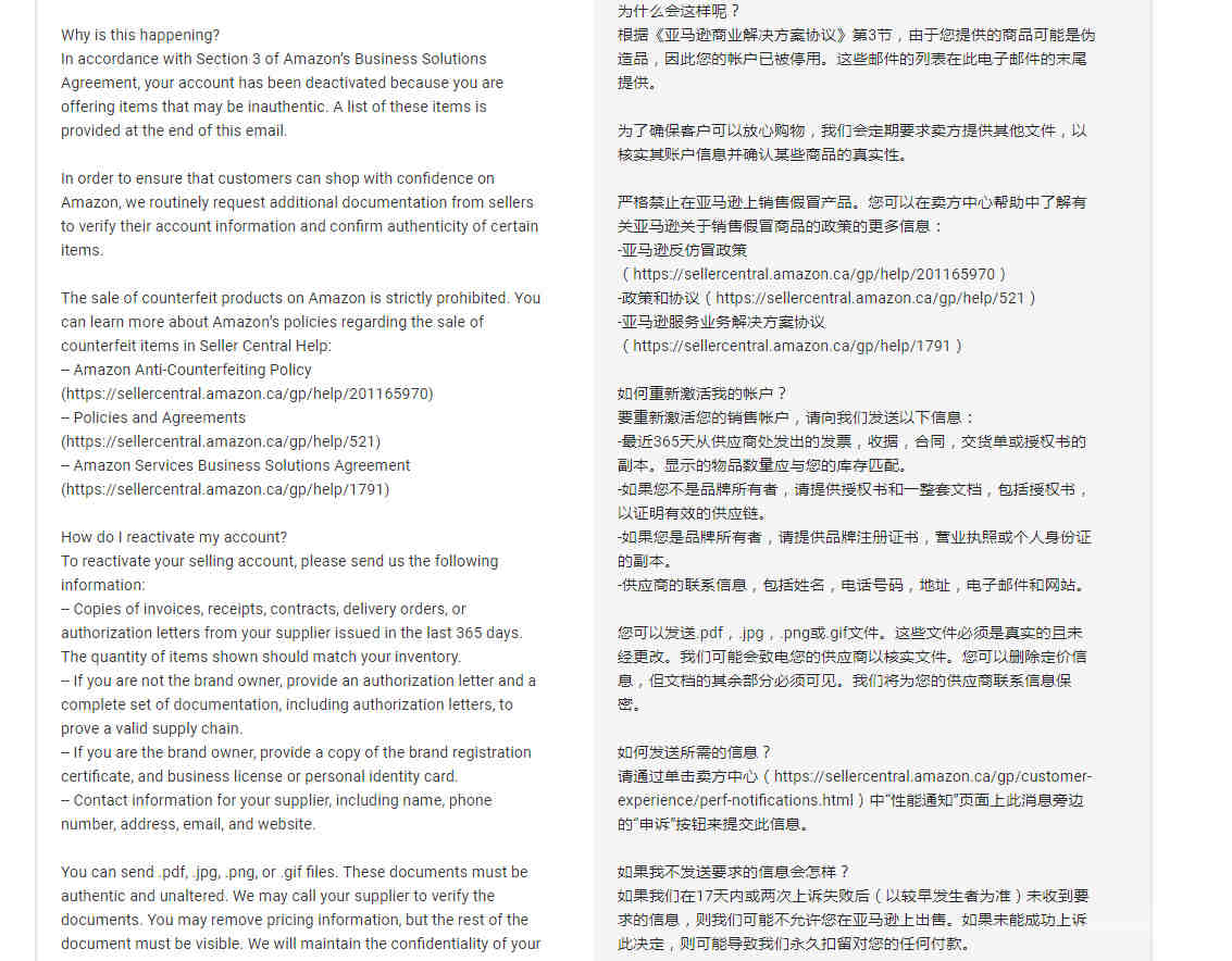 In accordance with Section 3 of Amazon’s Business Solutions Agreement, your account has been deactivated because you are offering items that may be inauthentic. A list of these items is provided at the end of this email.