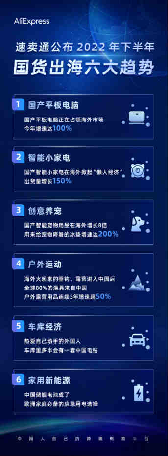 不仅是宠物经济,8月31日,速卖通公布了2022年下半年“国货出海六大趋势”,像智能小家电、户外运动用品等在国内新近火爆的优质国货,在海外也深得消费者喜爱。