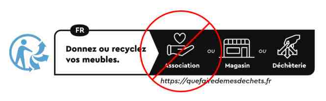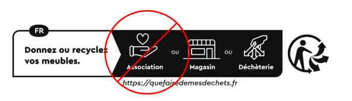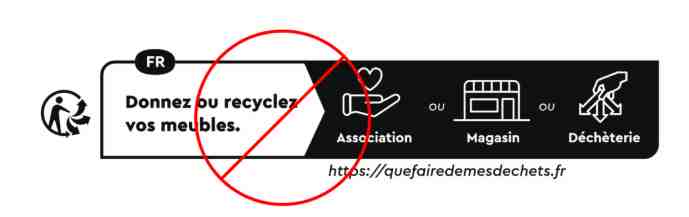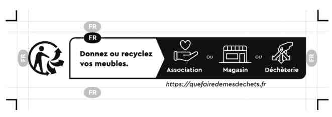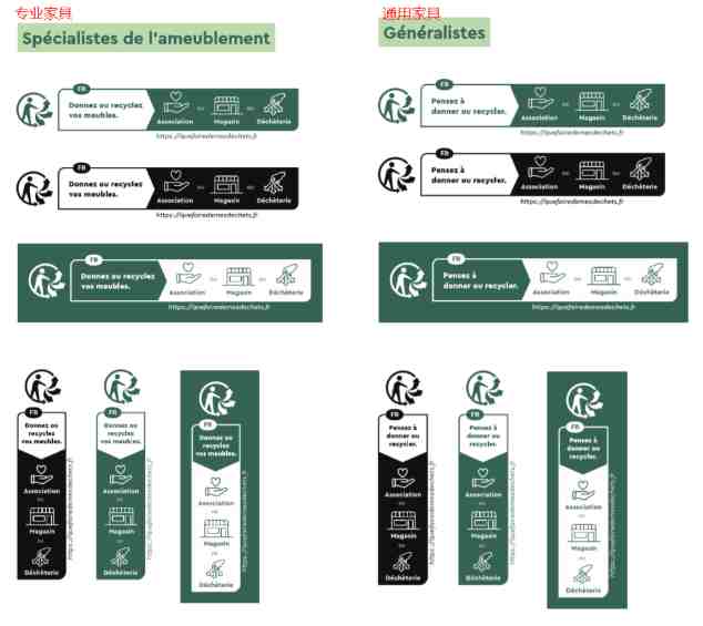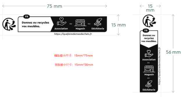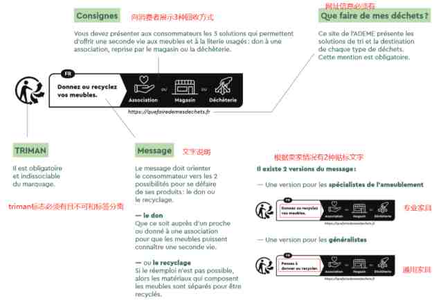 法国家具印刷标志由4部分组成:① Triman标志+②文字说明+③三种回收方式+④网址信息;但专业家具和通用家具印刷标志的“文字说明”会有差异,卖家根据自身情况选择对应印刷标志即可: