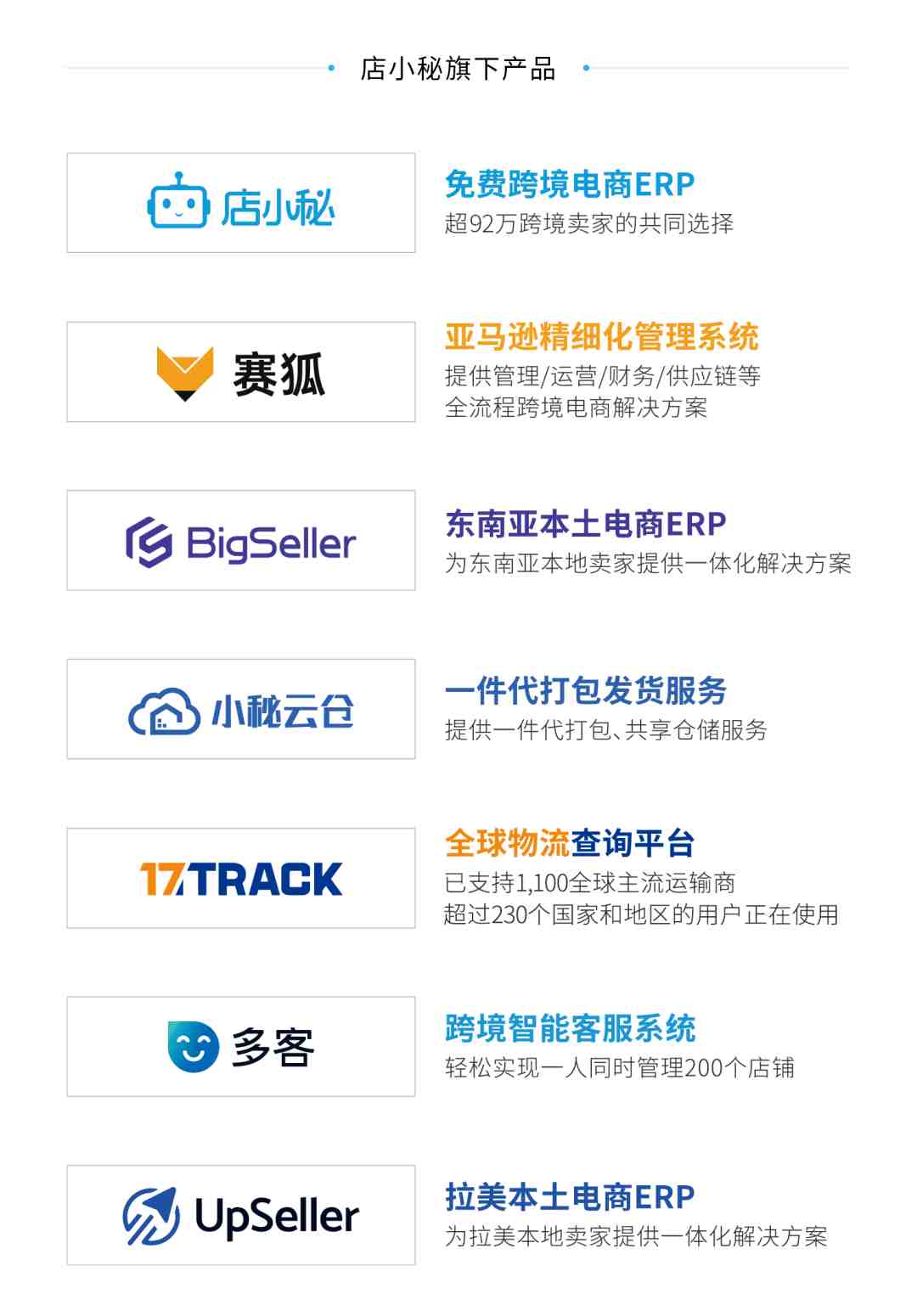 自2014年创立以来,店小秘始终坚持以电商卖家需求为导向,以产品品质为根本,从“SaaS系统”这一细分领域开始,通过对电商ERP、客服系统、云仓服务与物流查询等方面的不断创新技术,逐步拓展,形成了店小秘ERP、赛狐ERP、BigSeller ERP、UpSeller ERP、多客、小秘云仓、17TRACK等定位鲜明、赋能卖家增长业务的产品组合,“店小秘”已成为一个有口皆碑的跨境公众品牌。