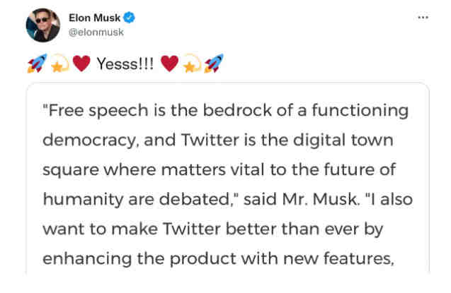 Twitter同意马斯克以每股54.20美元的要约价格,并且可能即将宣布一项估值为440亿美元的交易。该交易预计将于2022年完成,但须经Twitter股东批准、相关监管批准并满足其他惯例成交条件。分析师表示预计不会有监管障碍。对此,马斯克本人难掩兴奋,当天就转发了相关声明,并配以“Yesss!!!”和心形、星星和火箭等图案来表达自己喜悦的心情。