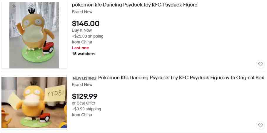 在eBay上,目前售价最高的可达鸭为$145加上$25运费,折合人民币1140元;在日本二手网站Mercari上可达鸭的售价为12999日元(约合人民币680元),是原69元儿童套餐的近10倍,目前价格也正在火爆的上涨当中!