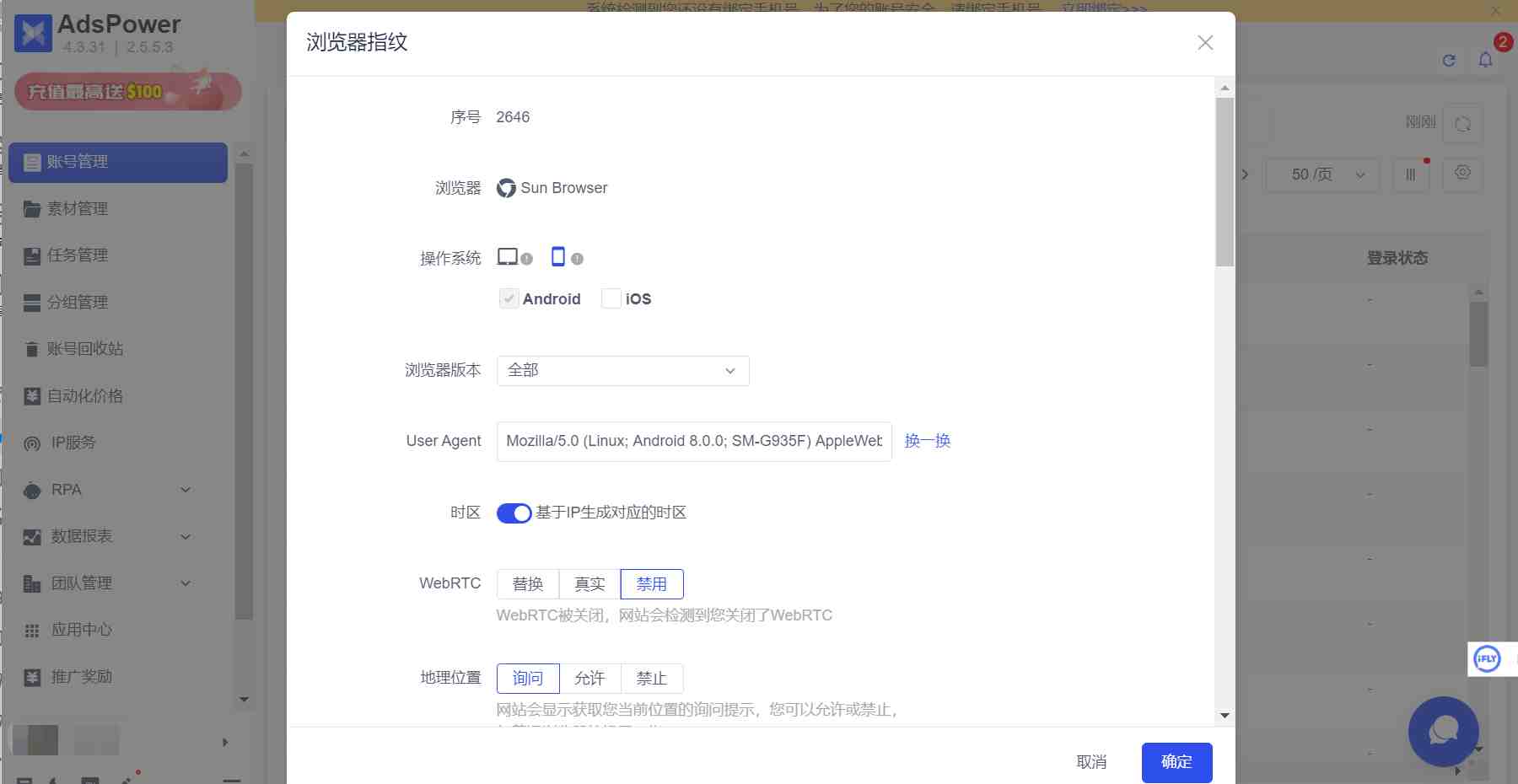 因为手机浏览器指纹辨识的信息可以是 UA、时区、地理位置或者是使用的语言等等,所以我们想要给我们的社媒营销账号提供一个安全的浏览器环境,就需要提供一个平台一套专属的浏览器指纹信息,让平台认为我们是在合法合规的普通用户。