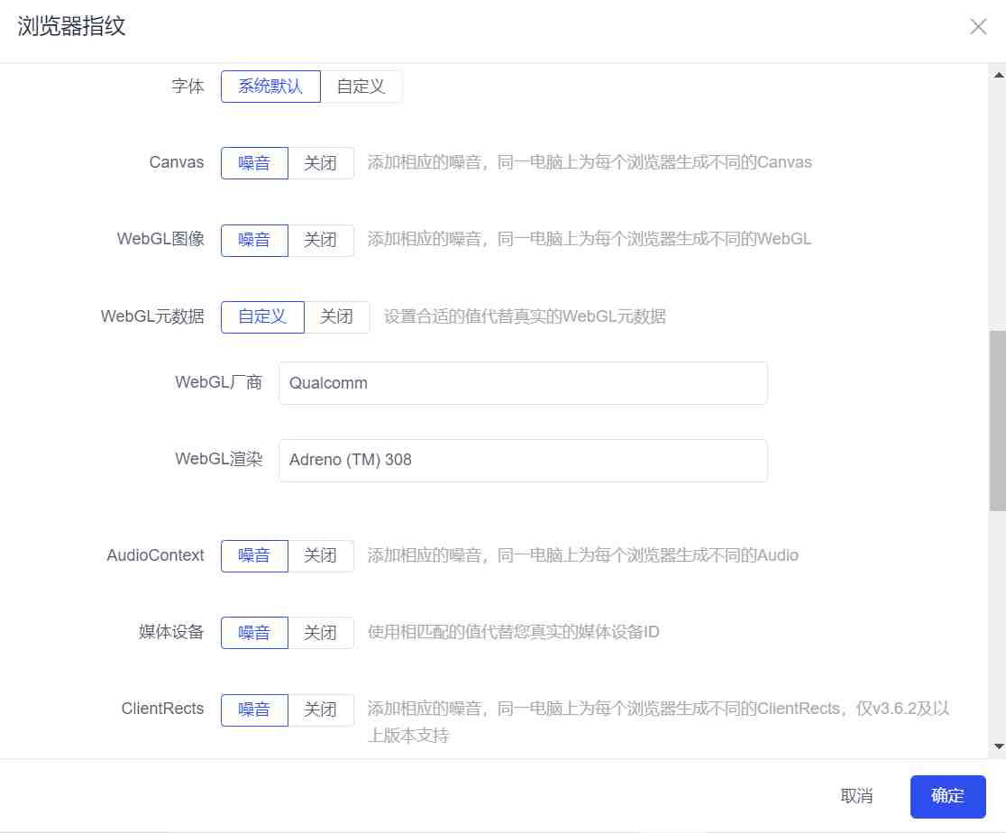 以Adpower指纹浏览器为例,它就是添加混淆值(俗称噪音)或者直接修改指纹信息(UserAgent、屏幕分辨率、CPU核心数、内存大小、插件信息、语言、Canvas指纹、Webgl指纹、AudioContext指纹、WebRTC指纹、字体指纹)等。