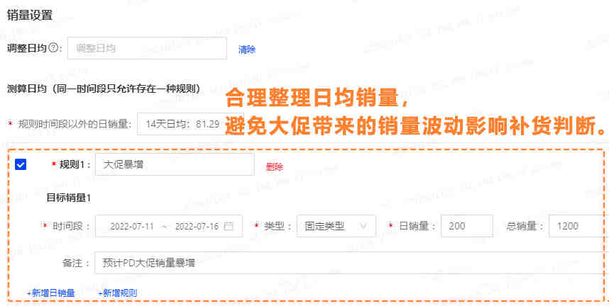 01. 调整日均销量值。大促前后往往伴随销量增长,那么我们不能再以淡季的日均销量来备旺季的库存。建议大家根据往年旺季的涨幅,适当增加日均值。