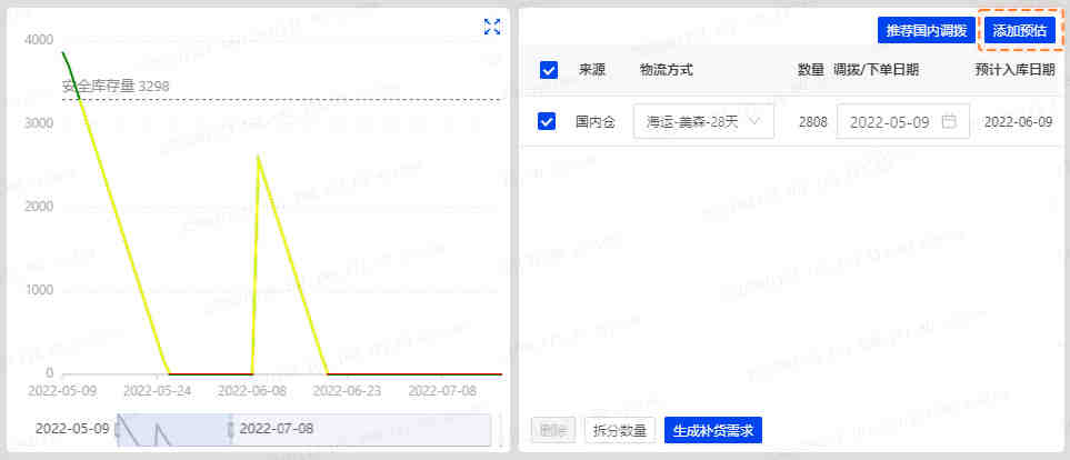 如果想要在发货之前先预测一下自己的补货计划是否合理,还可以使用智能补货—红绿线中添加预估发货计划进行模拟计算,看你的补货计划能否顺利赶上未来的断货时间段。【点击了解积加ERP】
