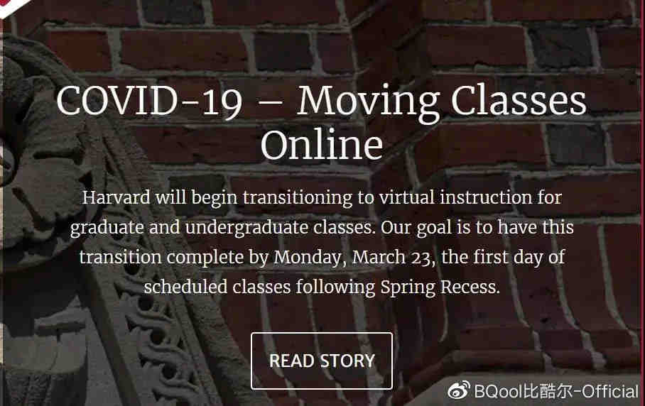 3月10日,哈佛大学宣布,从3月23日开始所有课程将转为网络授课,学生春假结束后不要重返校园。此外,斯坦福大学、哥伦比亚大学等超过100所美国高校宣布取消线下课程,改为远程教学。