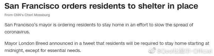 美西当地时间3月16日,据CNN新闻报道,旧金山市长下令居民呆在家里,除非有必要的外出。