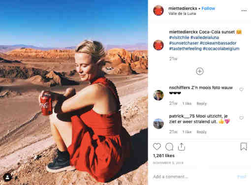 Miette Dierckx 是旅行和美食垂类的腰部网红,Instagram粉丝超过 35,000。作为可口可乐的品牌大使,她定期发布可口可乐相关的广告帖子,并贴上 #cokeambassador 标签。