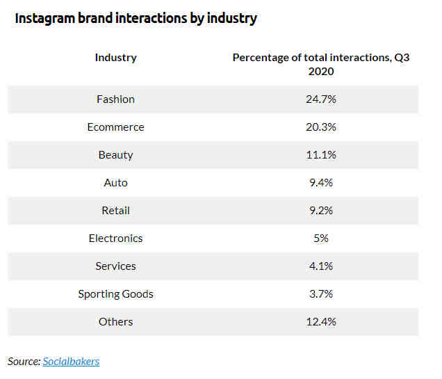 根据 Socialbakers 数据,Instagram平台活跃度最高的品牌主要来自时尚、电商及美妆行业。品牌商家能够抓住平台调性,利用视觉创意进行广告宣传,提升品牌价值,与消费者互动交流。