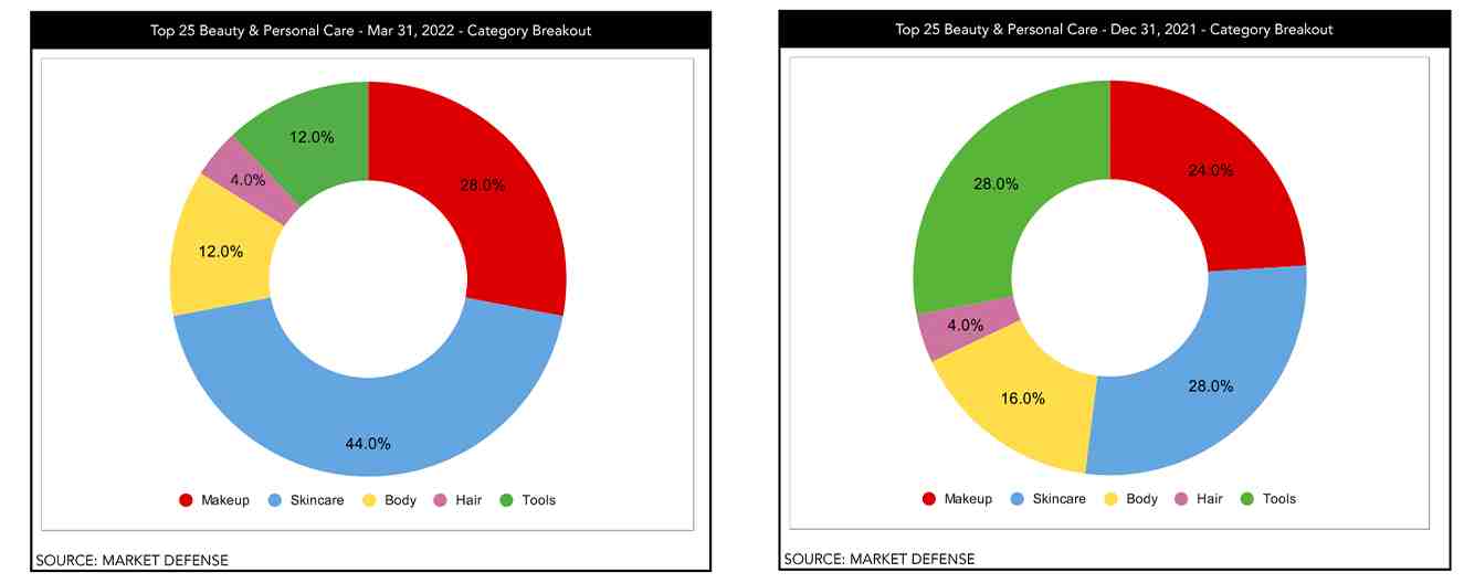 在第一季度,亚马逊美容个护TOP25榜单的最明显的变化之一是没有了口罩(上季度榜单第1和第8位),同时,护肤品和化妆品销量回升。护肤品在前25名中占比高达44%(高于上季度的28%),化妆品占比也增长到28%(高于上季度的24%)。