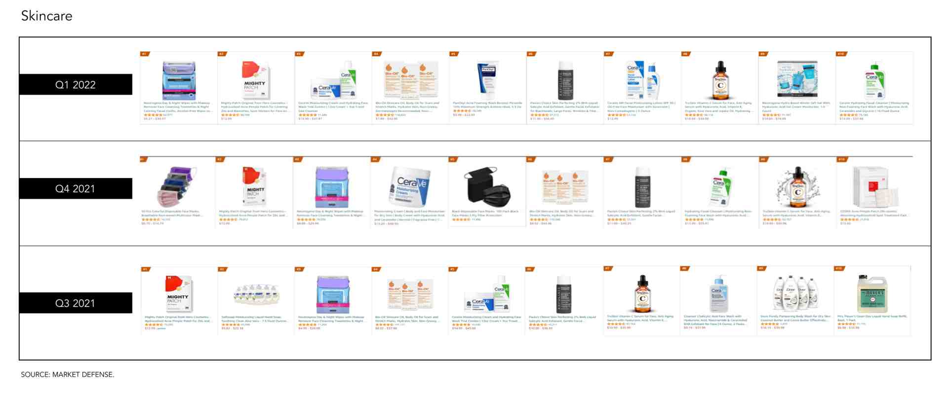 第四季度的十大护肤品SKU主要集中在大众和知名品牌上,常年受欢迎的CeraVe、Neutrogena和Bio-Oil在该品类中占主导地位。祛痘贴仍然是表现最好的产品,Mighty Patch占据了第二位(仅次于面膜),COSRX在该品类中排名第十位。