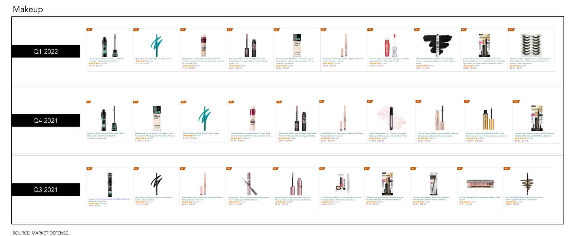 排名前十的彩妆产品继续被眼部和睫毛产品所占据。Essence Lash Princess False Lash Effect Mascara连续两个季度保持在第一的位置,而NYX Mechanical Eye Pencil in Aqua Green则从上季度的第三位上升到本季度的第二位。美宝莲在本季度的十大产品中占了四席。