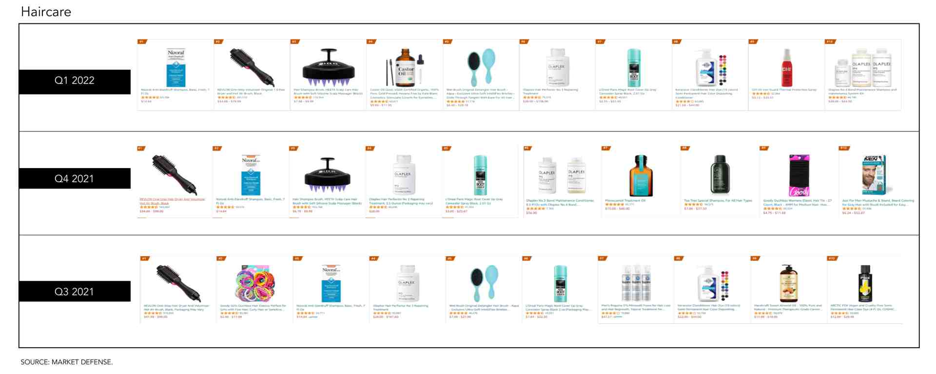 Nizoral去屑洗发水占据了护发品类的榜首,将Revlon的一步式吹风机和丰盈剂在两个季度的榜首位置后推至第二位。Olaplex仍在前十名,有三款产品上榜,尽管该品牌的排名比上一季度略有下降。第一季度有两款刷子上榜,HEETA头皮护理刷排名第三,Wet Brush Original Detangler发刷排名第五。
