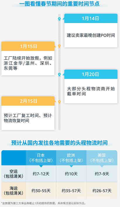 ▣ 春节前一周(2022年1月24日-1月30日)是传统出口的旺季,可能会出现拼箱仓库爆仓、整箱缺箱、缺卡车运力等现象,建议卖家尽早发货,避开春节前一到两周,以免造成延误导致额外物流费用支出。