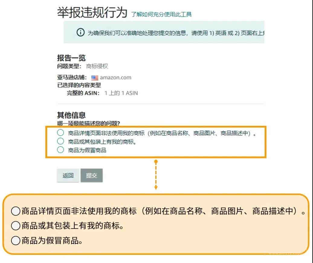 于是小王通过测试购买(Test Buy),证实了B店铺跟卖的产品为假货。他选择“商标侵权”后,又来到了这个页面,这次举报,小王该选啥?