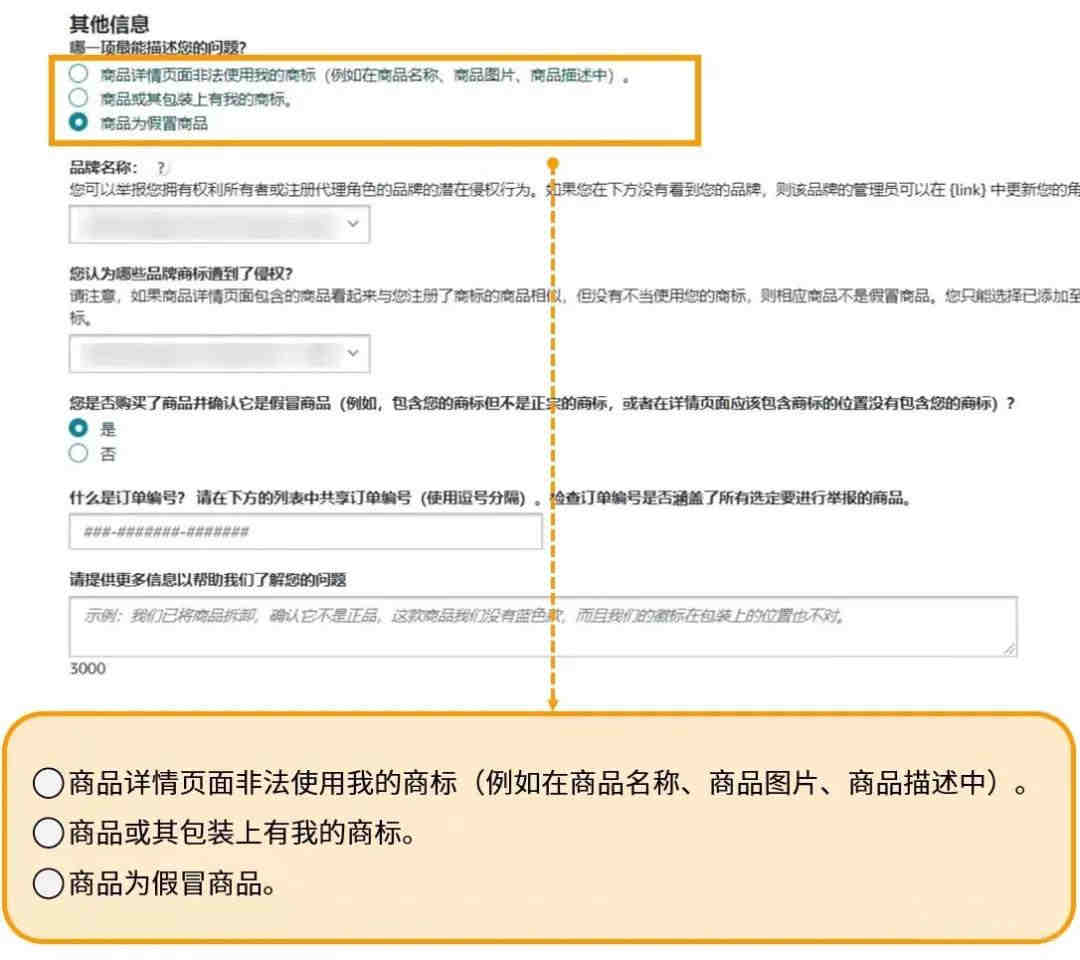 在“请提供更多信息以帮助我们了解您的问题”处,请勿将举报理由简单写为“我没有授权该卖家销售我的产品”,而应描述该跟卖产品为假货