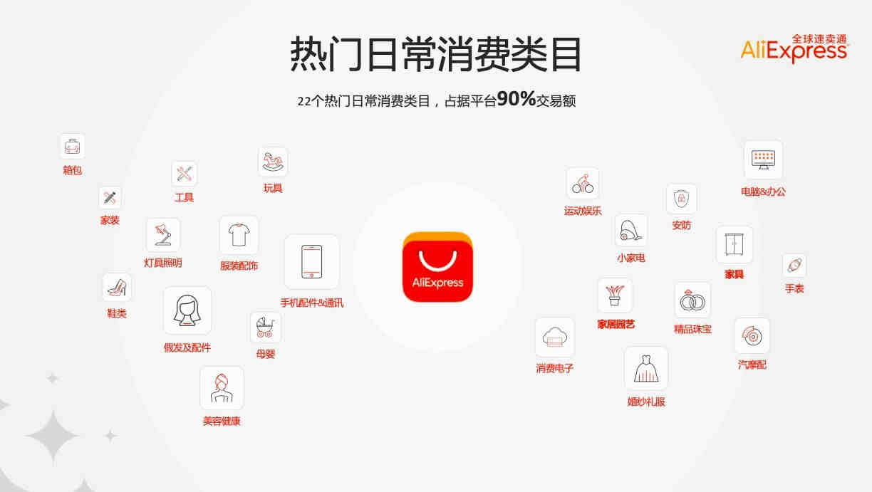 主营品类:全球速卖通覆盖3C、服装、家居、饰品等等共30个一级行业类目;其中优势行业主要有:服装服饰、手机通讯、鞋包、美容健康、珠宝手表、消费电子、电脑网络、家居、汽车摩托车配件、灯具等等。