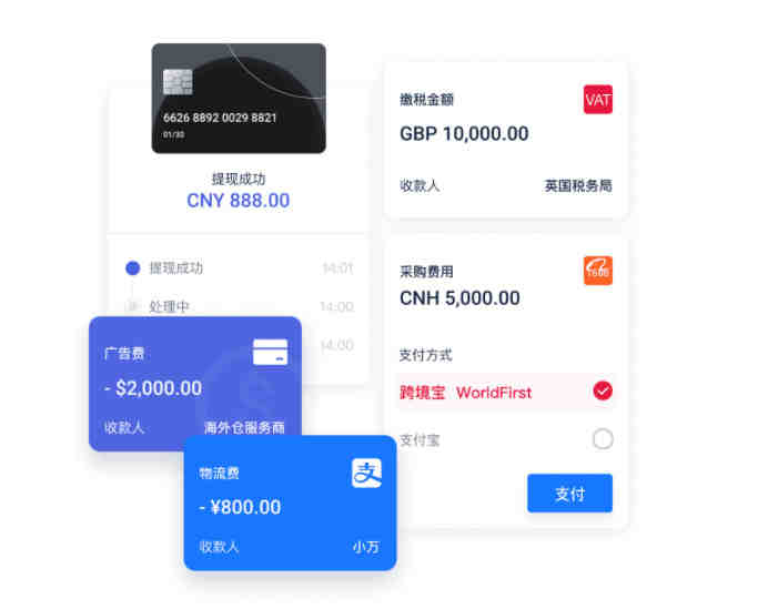 丰富的支付场景:VAT/1688跨境宝/物流费/仓储费/广告费等