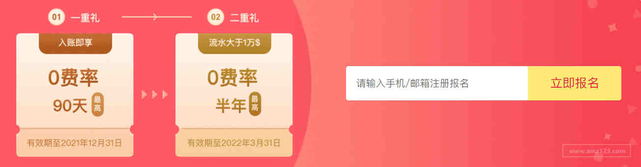 流水礼 :符合入账礼条件的用户,活动期间新增流水累计达到 1 万美金,可享截至 2022 年 3月 31 日人民币提现 0 费率。(名额有限,仅限前 400 名)