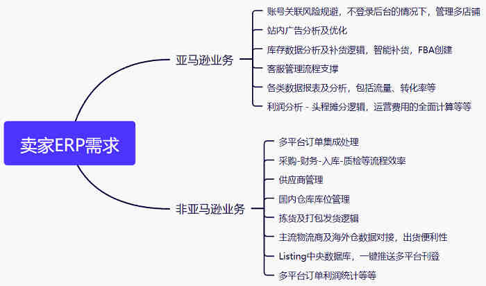 根据以上,我们对“亚马逊为主、其他平台经营为辅的电商卖家”对ERP的需求进行过分类,我们用一张思维导图来表达这一个观点。