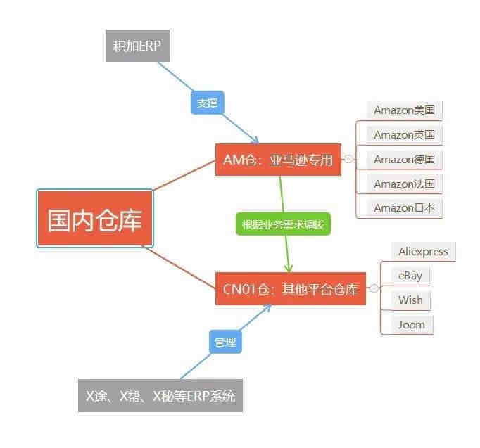 1.国内仓库设置为两个虚拟仓库,库存分开管理,两个仓库之间可以进行库存调拔;