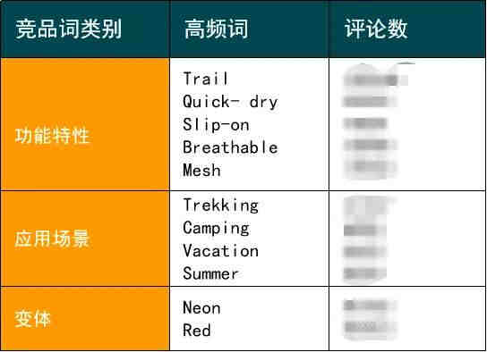 新出现的Slip-on(一脚蹬)、Breathable(透气的)、Camping(野营)等,这些词是在竞品详情页中出现频率较高的新词,与自己产品的功能和应用场景都很接近,评论数也多,暂且可判定为对流量转化有帮助的词,补充进Bob的关键词词库里。
