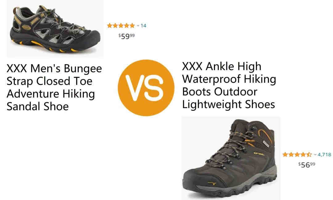以图中两款登山鞋为例,右边产品的评论数比左边的整整高出337倍,一看就是爆款;另一款却无人问津只有14条评论,究竟是什么影响了它们的效果表现?这里标题的差异是关键点!