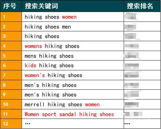 Bob销售的产品是登山鞋,在优化关键词前他要做的第一步是通过观察其他同类产品的标题,定位如“Hiking shoes”, “Trekking shoes”, “Outdoor shoes”等关键词。