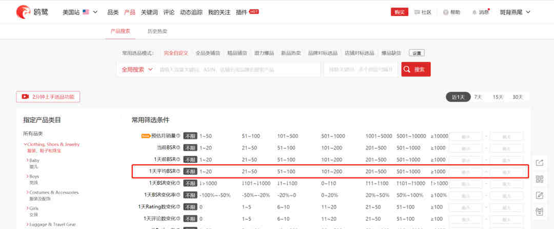 针对市场的多变性,鸥鹭做出了数据每日更新;针对不同的卖家定位,鸥鹭扩大了BSR的筛选范围,不局限于Top100,增加Top20、50、100、200、500、1000、2000等多范围指标。