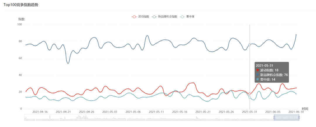 在经营过程中,卖家最关心市场份额、市场竞争度、头部卖家垄断程度、市场变化趋势、淡旺季情况。鸥鹭针对这些都从多维度进行了分析,比如头部卖家垄断程度方面,鸥鹭给大家提供了波动指数、新品牌机会指数、品类集中度等三个指标,在结合评论头部卖家的数据,能够比较客观的得出垄断程度的结果。