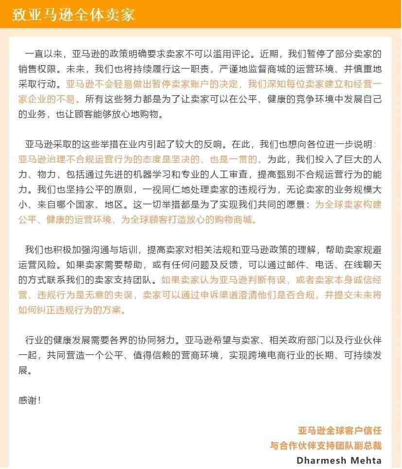 信件中,亚马逊明确了前阵子封号原因就是因为滥(shua)用(dan)评论,表示了平台深知每位卖家建立和经营一家企业的不易,所以不会轻易做出暂停卖家账户的决定。